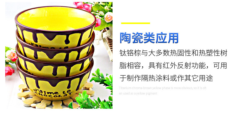 本公司生產(chǎn)的復(fù)合無機顏料具有易分散、良好的遮蓋力,優(yōu)異的耐光、耐候、耐熱穩(wěn)定性,化學(xué)品性,無滲色和遷移:與大多數(shù)熱塑性和熱固性樹脂相容,是一種公認的”復(fù)合型顏料”。 主要適用外墻、氟碳、建筑、工程機械、航空及船、汽車、軍事偽裝、卷鋼、道路標(biāo)志、巖體壁面、繪畫、粉末、油性、水性、耐曬、耐侯、抗紫外線、耐高溫涂料等;適用于彩色玻璃,日用玻璃,建筑陶瓷(釉上、釉下)彩色油墨,彩色砂石等領(lǐng)域:適用于樹脂,一般塑料、工程塑料、特種、塑料,色母粒等:適用于對復(fù)合性能有要求較高的領(lǐng)域,加工食品包裝容器,兒童玩具,生活餐具等塑料制品的著色。
